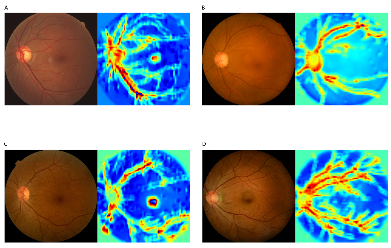 圖2. 深度學習模型熱圖提示人工智能模型預測發病(A、B)及進展(C、D)主要關注視盤邊緣和盤沿上、下血管弓區域,與臨床上的關注點極為相似