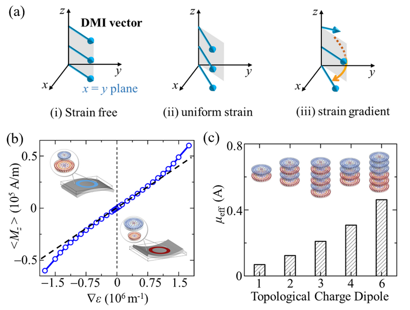 圖1:撓曲磁效應: (a)不同應變狀態下的DM作用;(b)凈磁化隨應變梯度響應的理論計算結果;(c)等效撓曲磁系數的拓撲增強效應。