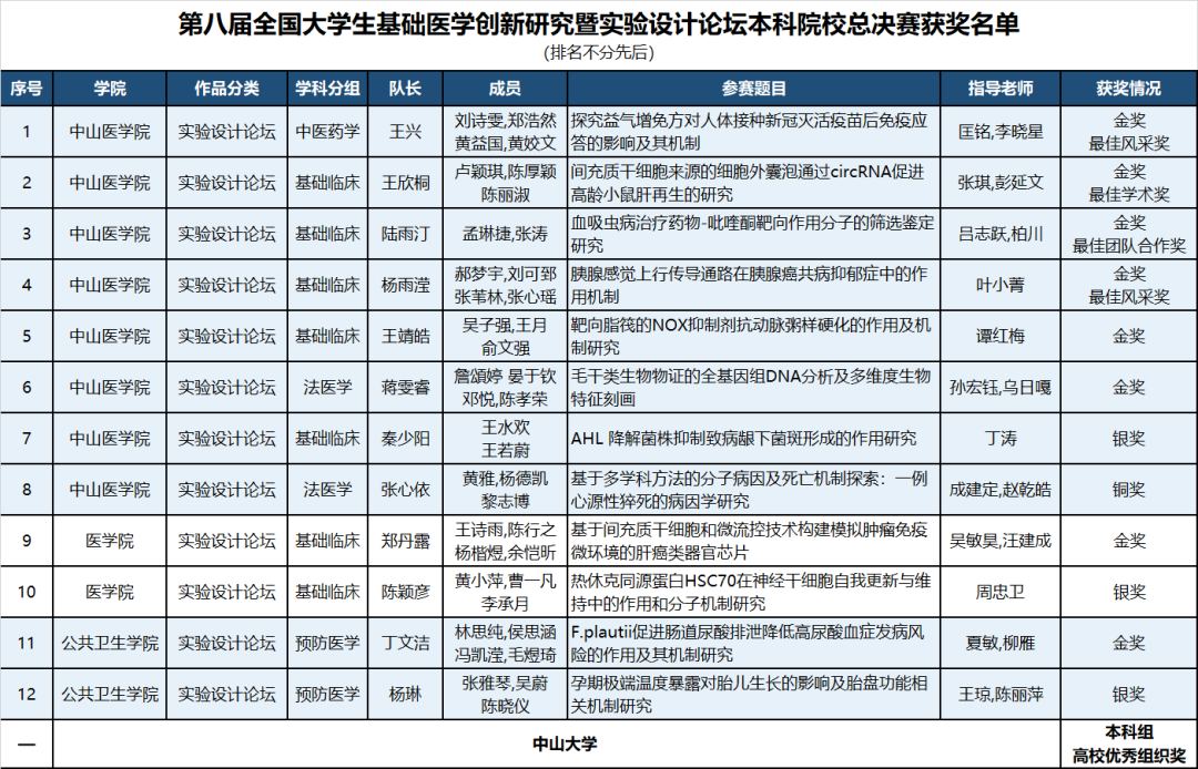 中大新聞網(wǎng)廣州2月1日電(通訊員劉夢(mèng)圓)近日,第八屆全國(guó)大學(xué)生基礎(chǔ)醫(yī)學(xué)創(chuàng)新研究暨實(shí)驗(yàn)設(shè)計(jì)論壇(以下簡(jiǎn)稱基礎(chǔ)創(chuàng)新大賽)總決賽在吉林大學(xué)基礎(chǔ)醫(yī)學(xué)院舉行,全國(guó)三十多個(gè)省份共140余所高校派出430支參賽隊(duì)伍,共計(jì)2000余名師生參加。我校中山醫(yī)學(xué)院、醫(yī)學(xué)院和公共衛(wèi)生學(xué)院共派出12支隊(duì)伍參加此次總決賽。經(jīng)過兩天激烈角逐,我校共斬獲8金3銀1銅的歷史佳績(jī),其中中山醫(yī)學(xué)院學(xué)生在基礎(chǔ)臨床、法醫(yī)學(xué)和中醫(yī)藥學(xué)賽道共獲得6金1銀1銅的好成績(jī),公共衛(wèi)生學(xué)院在預(yù)防醫(yī)學(xué)賽道獲得1金1銀,醫(yī)學(xué)院在基礎(chǔ)臨床賽道獲得1金1銀。此外,我校還獲得本科組高校優(yōu)秀組織獎(jiǎng)。