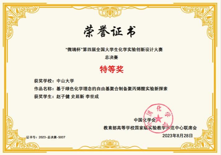 中大新聞網訊(通訊員肖華)8月20-23日,“微瑞杯”第四屆全國大學生化學實驗創(chuàng)新設計大賽總決賽在浙江大學舉行,中山大學化學學院阮文紅、朱芳兩位教授共同指導2021級本科生趙子健、史延新、李世成參賽并榮獲總決賽特等獎,獲獎作品為“基于綠色化學理念的自由基聚合制備聚丙烯酸實驗新探索”。