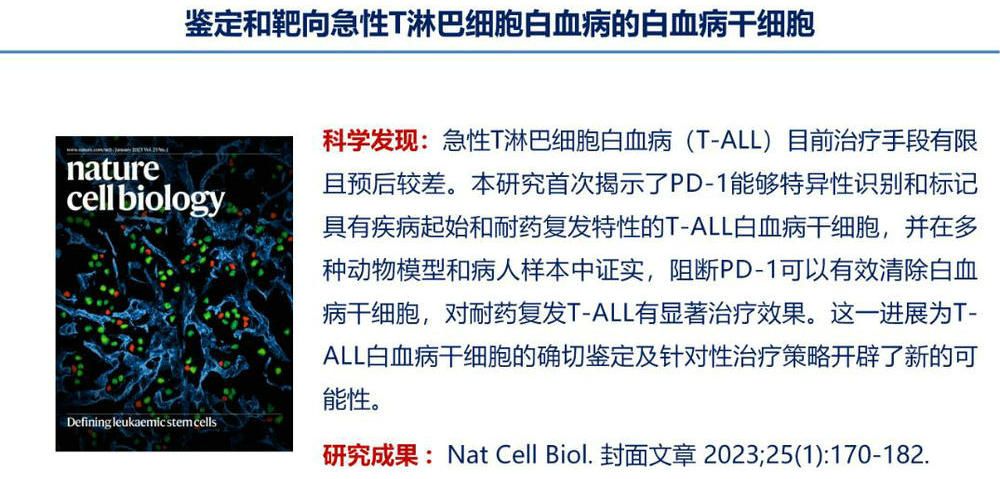 急性T淋巴細胞白血病 (T-ALL) 目前治療手段有限且預后較差。本研究首次揭示了PD-1能夠特異性識別和標記具有疾病起始和耐藥復發特性的T-ALL白血病干細胞,并在多種動物模型和病人樣本中證實,阻斷PD-1可以有效清除白血病干細胞,對耐藥復發T-ALL有顯著治療效果。這一進展為T-ALL白血病干細胞的確切鑒定及針對性治療策略開辟了新的可能性。相關研究成果以封面文章的形式發表在2023年1月的Nature Cell Biology雜志。