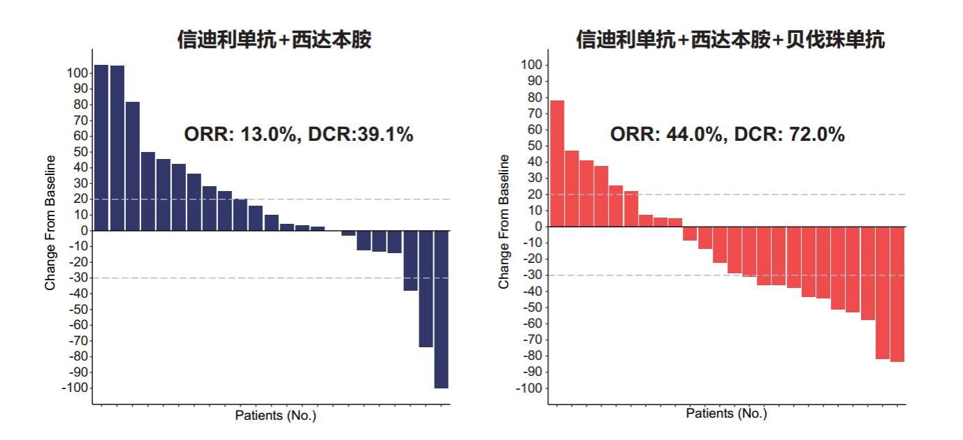 CAPability-01研究是一項全國多中心、隨機、雙臂、II期研究,研究在全國四個中心開展(中山大學腫瘤防治中心,浙江大學醫學院附屬第一醫院,廣西醫科大學第一附屬醫院,哈爾濱醫科大學附屬腫瘤醫院),共納入了48例符合入組條件的標準治療失敗的微衛星穩定型/錯配修復正常型晚期結直腸癌患者,患者按1:1隨機分配至西達本胺+信迪利單抗+貝伐珠單抗的三藥組與西達本胺+信迪利單抗的兩藥組接受治療。研究主要終點為接受治療后第18周的無進展生存(PFS)率,次要終點為總生存期(OS)、客觀緩解率(ORR)、疾病控制率(DCR)、緩解持續時間(DOR)及安全性等。