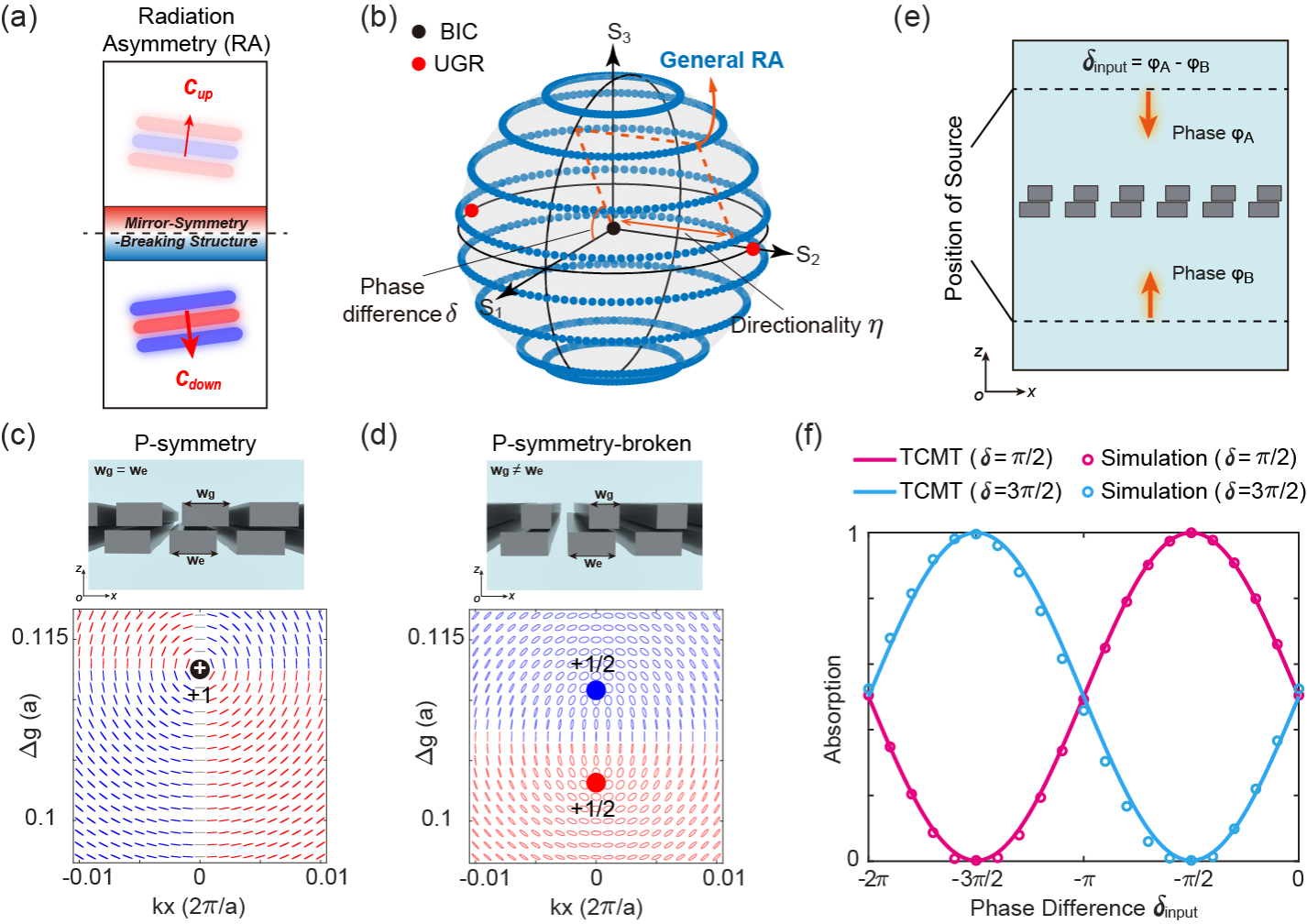 圖1. (a) 上下輻射振幅和相位不同的非對稱輻射;(b) 任意非對稱輻射的龐加萊球表示;(c, d) 打破空間反演對稱性前后的贗偏振場分布;(e) 相干吸收示意圖;(f) 不同輻射相位差情況下,相干吸收隨入射光相位差的變化。