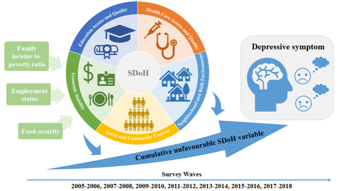 抑郁癥是全球最常見的心理疾病之一,全球抑郁癥病例數從1990年的1.72億增加到2017年的2.58億(增長了49.86%),已成為一項重要的公共衛生問題。團隊在SDoH不平等視角下,探究了普通人群中不平等的SDoH與抑郁癥狀之間的關聯。其中,SDoH涉及5個領域(經濟穩定性、教育資源及質量、醫療資源及質量、鄰里和建成環境、社會和社區支持)共計8個變量,即就業狀況、家庭經濟水平、糧食安全、教育水平、健康保險覆蓋、健康保險類型、自有住房情況和婚姻狀況。
