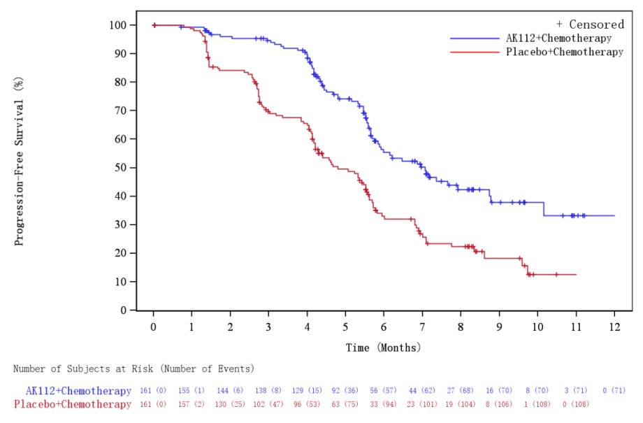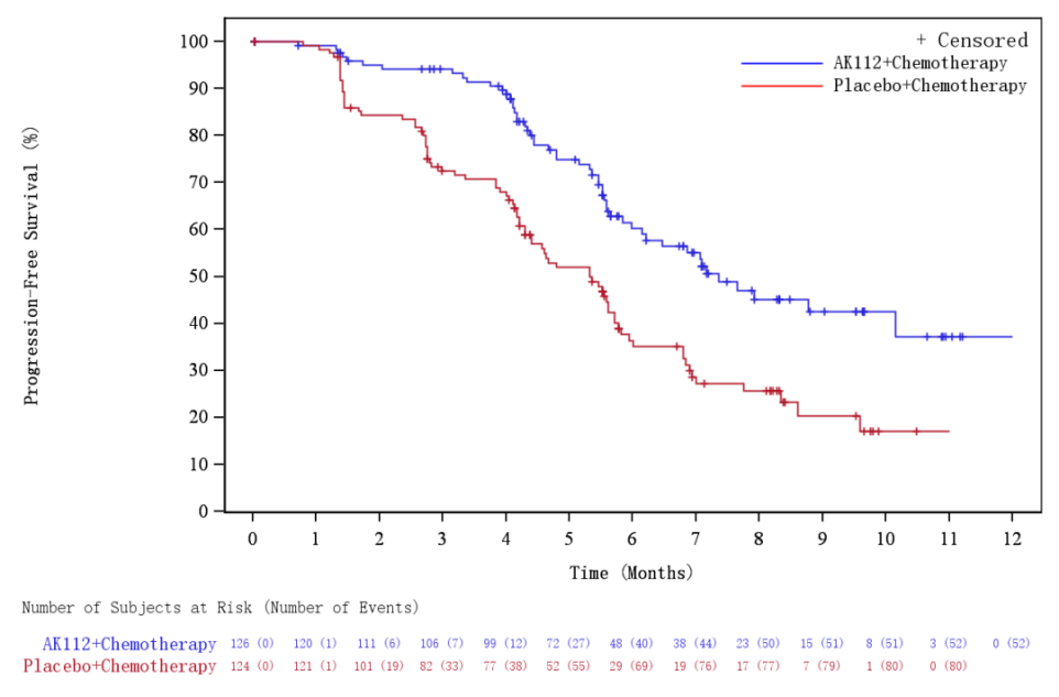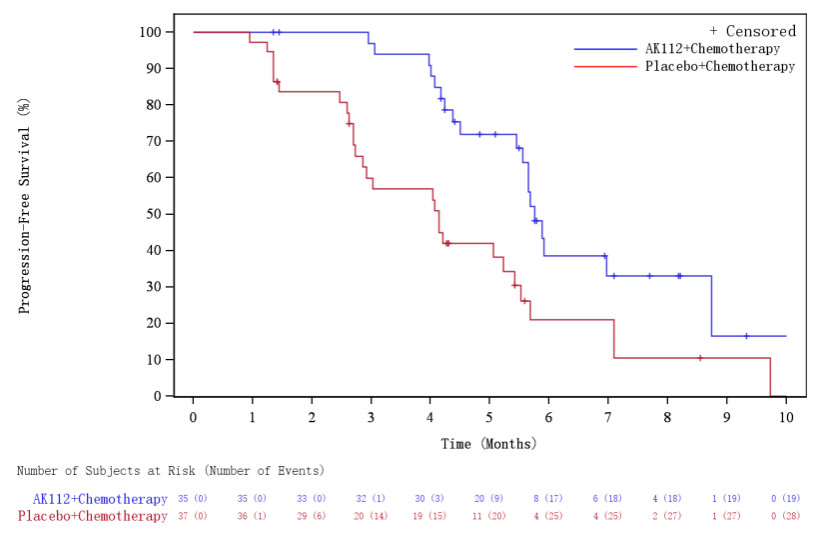 依沃西單抗聯合化療在3個月(94.7%對69.7%)、6個月(55.4%對33.1%)和9個月(37.9%對18.3%)的無進展生存期率均高于單獨化療。