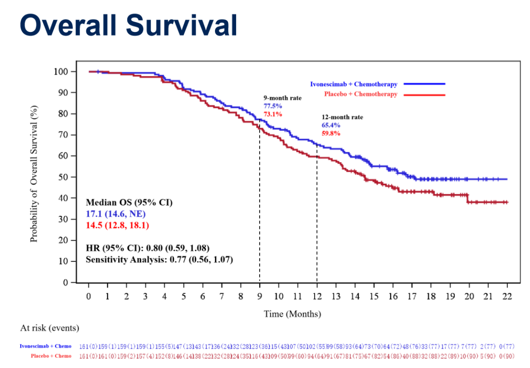 依沃西單抗聯合化療對比化療組的客觀緩解率(ORR)為50.6%(95% CI 42.6-58.6)和35.4%(95% CI 28.0-43.3)。截至2023年12月,中位隨訪時間為17.6個月,依沃西聯合方案中位總生存期為17.1個月,對照組中位生存期為14.5個月,降低死亡風險20%(HR 0.8,95% CI: 0.59 ~1.08)。敏感性分析顯示,依沃西單抗聯合方案組觀察到生存期有明顯延長趨勢,降低死亡風險23%(HR 0.77,95% CI: 0.56 ~1.07 )。