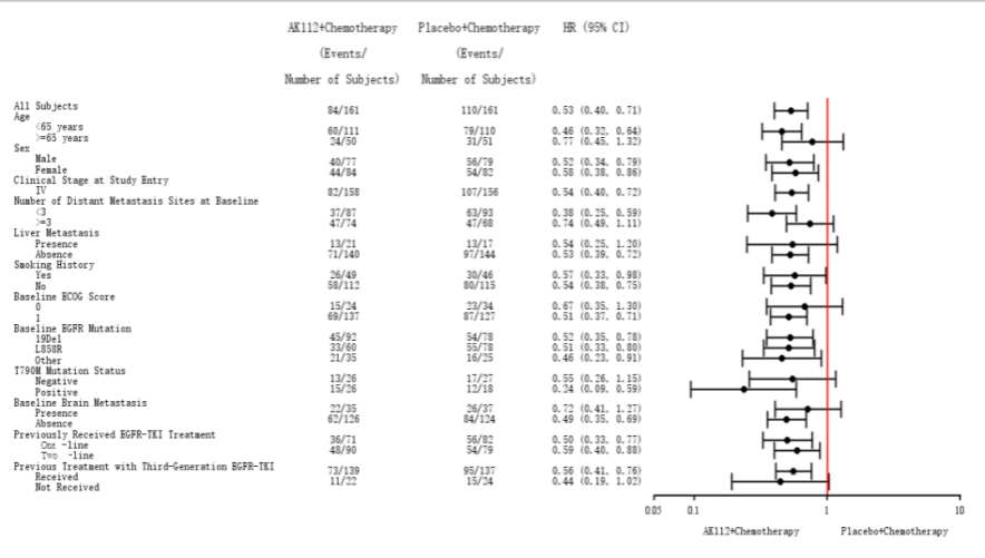 亞組分析顯示,幾乎所有預設亞組都觀察到與總人群一致的無進展生存期獲益,并具有顯著統計學意義。在接受第三代EGFR-TKI治療失敗(HR 0.48, 95% CI 0.35-0.66)、基線有腦轉移(HR 0.40, 95% CI 0.22-0.73)、EGFR突變為19號外顯子缺失(HR 0.48, 95% CI 0.32-0.73)以及T790M突變陽性(HR 0.22, 95% CI 0.09-0.54)的患者亞組中,依沃西單抗聯合方案均顯示出無進展生存期獲益優勢。
