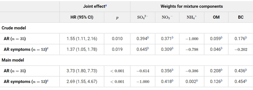 該研究追蹤調(diào)查來自廣州越秀出生隊列的657名母子對,通過病歷診斷和標準化問卷調(diào)查收集了幼兒出生至2歲的過敏性鼻炎發(fā)生情況。基于2016-2019年期間中國大氣成分近實時追蹤數(shù)據(jù)集(Tracking Air Pollution in China,簡稱TAP)的日均污染物數(shù)據(jù),評估了母親從懷孕至分娩期間的PM2.5及其化學成分的平均暴露濃度,包括硫酸鹽(SO42-),硝酸鹽(NO3-),銨鹽(NH4+),黑碳(BC)和有機物(OM)。采用quantile-based g-computation 模型對PM2.5組分的混合暴露進行聯(lián)合作用分析,并以權(quán)重指數(shù)表示各組分的作用方向與相對貢獻。研究結(jié)果發(fā)現(xiàn)PM2.5每升高5 μg/m3與幼兒2歲以內(nèi)鼻炎及其癥狀風險分別升高1.85和1.79倍有關(guān);PM2.5的5種組分共同升高一個五分位數(shù)水平與鼻炎及其癥狀風險升高3.73和2.69倍有關(guān)。其中,黑碳在單污染物模型和多組分聯(lián)合暴露中均與幼兒鼻炎結(jié)局呈現(xiàn)正相關(guān),是組分聯(lián)合有害效應(yīng)的最大貢獻者(分別為43.6%和45.4%,見表1)。
