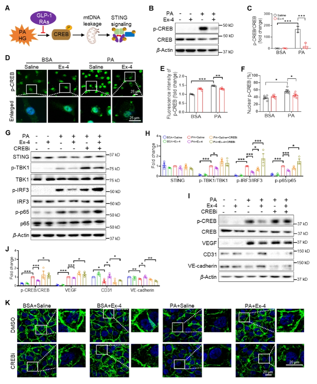 RNA測序結果顯示,STING通路被GLP-1 RAs顯著抑制;熒光染色檢測STING通路激活組分p-TBK1或STING的結果顯示,腹腔或玻璃體腔注射GLP-1 RAs均可以抑制DR血管的STING通路激活;細胞實驗也證實了GLP-1 RAs對高脂誘導的STING通路的抑制作用。研究進一步發現,CREB可能介導GLP-1 RAs對STING通路的調控作用。使用CREB抑制劑(CREBi)后,GLP-1 RAs對STING通路的抑制效果被阻斷,伴隨著內皮細胞緊密連接的保護作用也消失。