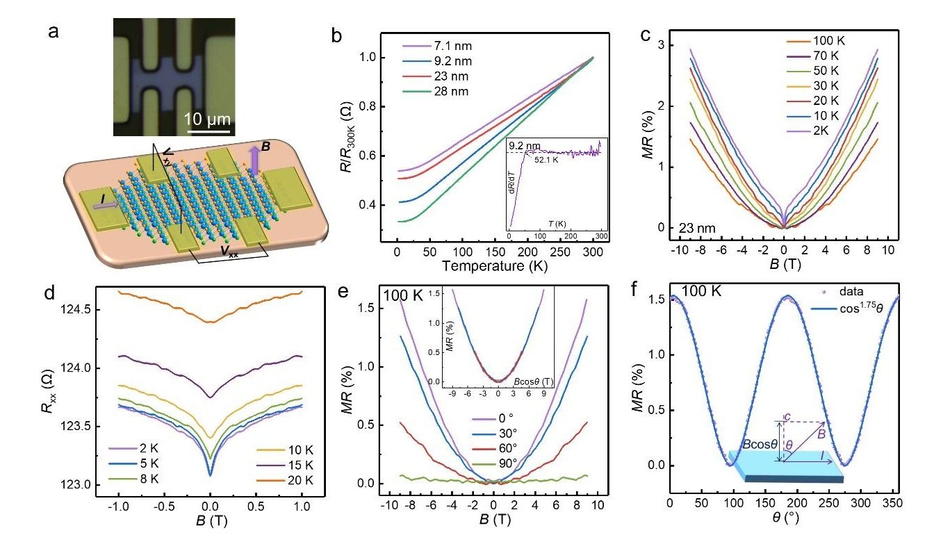 圖2. Janus Bi2TeSe2納米片的輸運(yùn)測試。(a) Hall bar器件;(b) 線性變溫電阻;(c)變溫磁阻曲線; (d)WAL效應(yīng);(e, f) 磁阻的角度依賴性.