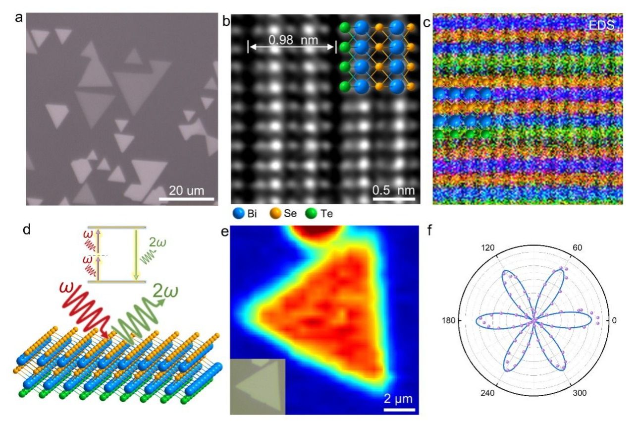 圖1. Janus Bi2TeSe2納米片的表征以及SHG測試。(a) 顯微圖像;(b) HAADF-STEM圖像;(c)原子級EDS mapping; (d) SHG原理圖;(e) SHG mapping; (f) 極化相關(guān)SHG.