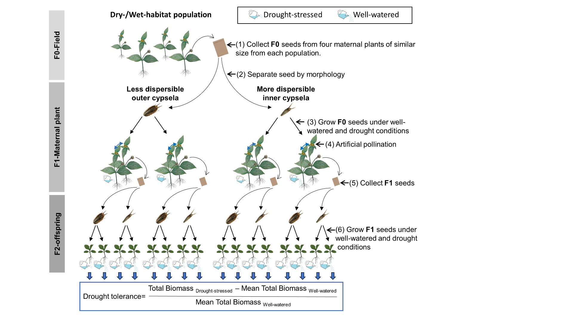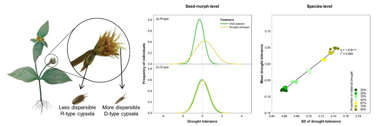 彭少麟團隊從水分脅迫出發,以全球廣布的菊科種子二型性植物金腰箭為研究對象,構建兩年三代水分處理實驗,詳細測定每株植物干旱脅迫與對照處理下產生的后代數量和耐旱性,首次報道了親本干旱誘導子代種內耐旱性變異變化與子代傳播能力的相關性(圖1)。結果表明,經歷干旱脅迫后,親本顯著提高了傳播能力較弱子代的耐旱性均值或變異,這種變化能夠在種群水平上得到體現,從而增強整個種群應對水分環境不確定性的適應能力(圖2)。脅迫耐受力變異和種子傳播能力存在較強交互作用,這可能是促進種子二型性物種廣泛分布的潛在適應性進化路徑,強調了種子二型性和脅迫耐受力變異對植物在多變環境下避免繁殖失敗風險的重要生態意義。
