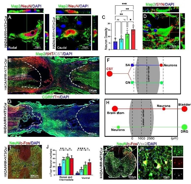 在該研究中,HADA/HRR+NT3/Cur水凝膠促進了損傷邊界中間神經元的存活。這些激活的中間神經元作為中繼站,與中斷的上下行神經纖維形成了異質性突觸結構,實現神經聯系的“精準”重建,促進了運動、感覺和膀胱功能恢復。