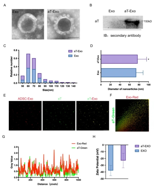 研究團隊通過基質金屬蛋白酶(MMPs)可切割肽鏈將抗TNF-α抗體(aT)連接于脂肪間充質干細胞外泌體(ADSC-Exo)表面構建工程化外泌體(aT-Exo),通過電鏡、免疫熒光共定位、納米流式及Zeta電位檢測等方法檢測aT-Exo的特征(圖1)。