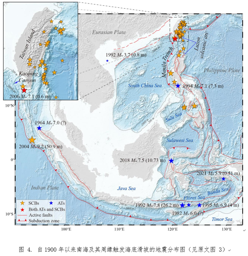 在新建立的全球 1900 年以來地震觸發的海底滑坡數據庫中,值得重點關注的是:南海及其周緣是地震觸發海底滑坡事件的高發區域。發生在南海及其周緣的事件達 51 起,全球占比 41%,空間上主要分布在南海東部中國臺灣省、呂宋海峽和菲律賓等海底光纜分布密集的區域(圖 4)。
