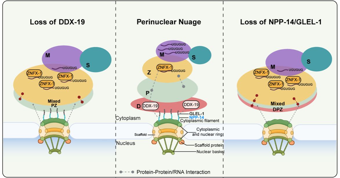 該研究在秀麗隱桿線蟲中發現,保守的DEAD-box RNA解旋酶DDX-19在核孔纖維與已知生殖顆粒亞區室(P、Z、M、S)之間,形成一個獨立的具有液相凝聚物特性的新區室,稱之為D區室。D區室依賴于保守的核孔纖維蛋白NPP-14和GLEL-1錨定在外核膜。DDX-19、NPP-14或GLEL-1的缺失會導致功能缺陷:包括其他四個生殖顆粒區室的結構重排、生殖細胞永生性的喪失以及基于小RNA的TEI的失調。