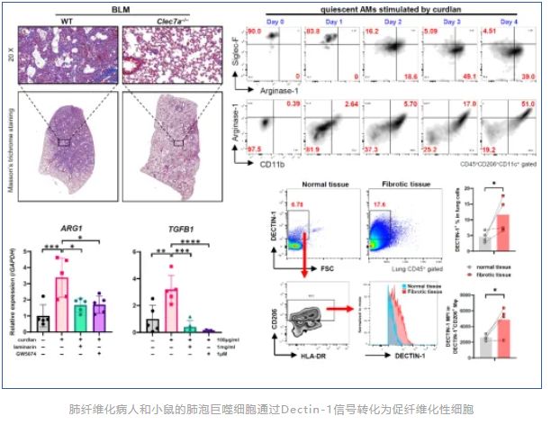 研究團隊在特發性肺纖維化患者的肺組織樣本和博來霉素誘導的肺纖維化小鼠模型中都觀察到,Dectin-1的表達水平顯著上調,且主要分布在肺泡巨噬細胞群體中。進一步的體內外實驗證實,Dectin-1活化后,會促使巨噬細胞從靜息型轉變為促纖維化表型,同時伴隨TGF-β與金屬基質蛋白酶的上調,進而促進基質重構和成纖維細胞活化。