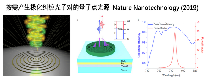 量子光源是量子信息和量子光電集成芯片不可或缺的量子器件。自發參量下轉換(SPDC)一直是產生量子光源的主要傳統方法。然而,這種方法不僅效率很低,而且本質上是概率性的,這些缺點限制了量子光源的可擴展性和可重復性。量子點(或其它輻射子)的量子光源可以根據需要由外部電脈沖或光脈沖觸發來產生確定性的單光子或糾纏光子對,但也存在很大困難:半導體材料的高折射率和側向及背向的光子泄露會嚴重降低量子光源的亮度(收集效率),其糾纏保真度和不可區分性也相對較低。因此,實現高亮度、高糾纏保真度和高不可區分性的“三高”量子光子源一直是量子信息科學領域的一個重大挑戰。