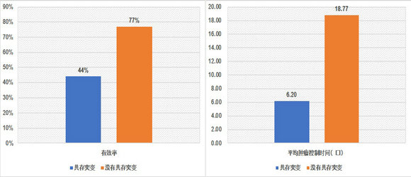 二代測(cè)序結(jié)果發(fā)現(xiàn)超過一半的患者存在EGFR基因以外的基因改變(共存突變)。存在共存突變的患者,有效率只有44%,平均腫瘤控制時(shí)間6.2個(gè)月,平均生存期22.7個(gè)月;而不存在共存突變的患者,有效率達(dá)到77%,平均腫瘤控制時(shí)間18.77個(gè)月。