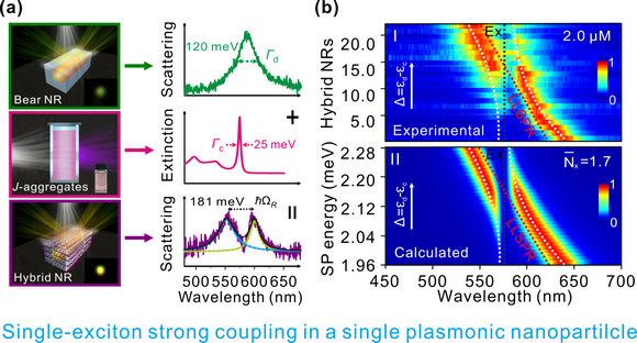 圖 一. (a) 單個Au@Ag方棒及單個Au@Ag 方棒/J-聚體強耦合系統的暗場測量結果;(b) 單個Au@Ag 方棒/J-聚體系統中所觀測到的反交叉色散關系。