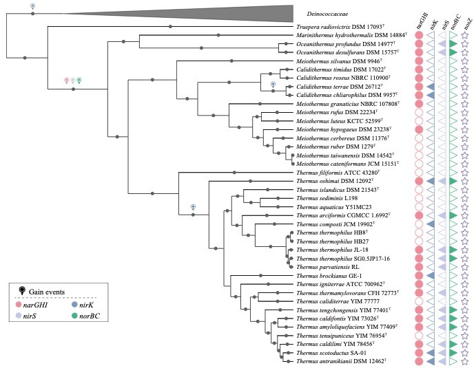 為了探究Thermus類群的反硝化功能基因,團隊進一步針對Thermus的反硝化基因開展了比較分析。結果表明,除了nosZ基因外,反硝化基因普遍存在于Thermus類群中(圖2)。此外,該研究針對Thermus的不完全反硝化過程的關鍵基因narG、nirK、nirS和norB分別進行進化分析,結果表明,narG、nirS和norB基因與nirK基因存在不同的進化歷史,結合基因序列位置關系,證明Thermus的不完全反硝化功能是在Thermales的早期進化獲得的,并且這些基因在很大程度上屬于垂直遺傳(圖2)。這也就意味著不完全反硝化功能普遍存在于Thermus類群中。