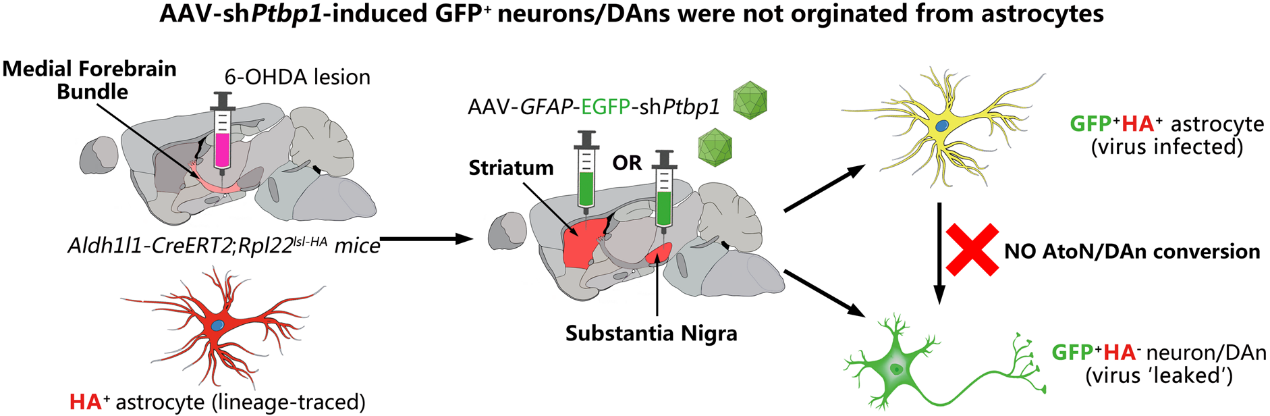 AAV-shPtbp1-GFP誘導產生的GFP+神經元/DA神經元并非來源于星型膠質細胞