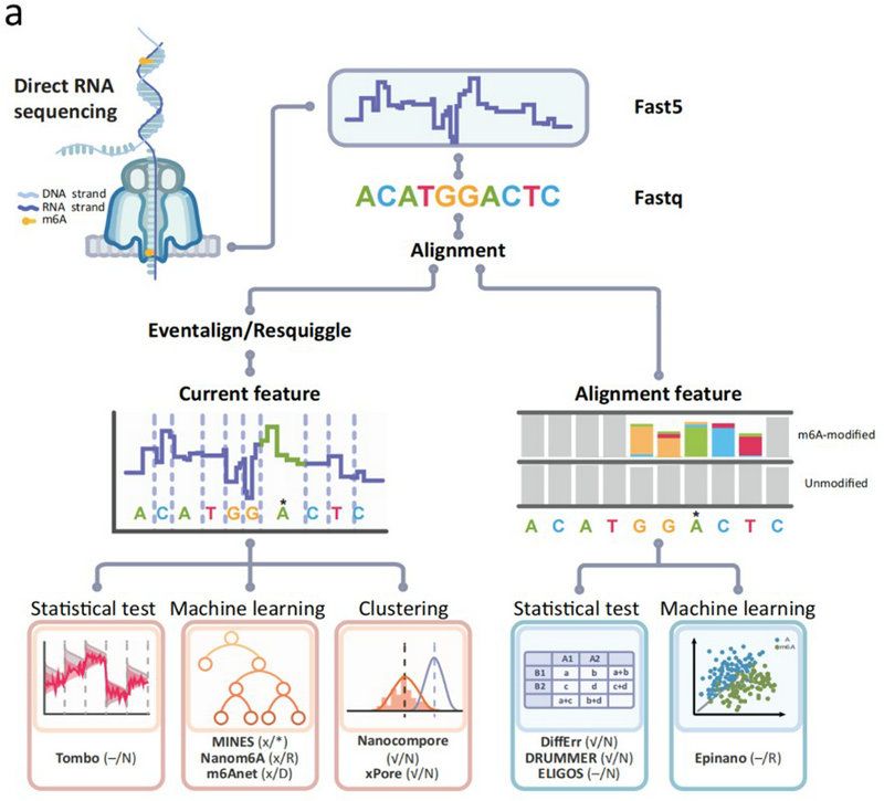 圖1 利用ONT DRS平臺實現m6A檢測的工具、流程以及分類