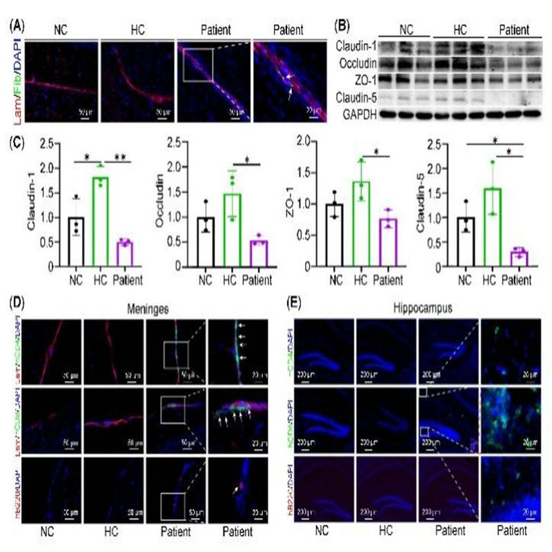 該研究發現,模型小鼠存在明顯的血腦屏障(BBB)破壞及緊密連接蛋白如Claudin-1\Occludin\ZO-1\Claudin-5蛋白下調(圖2A-C);并發現模型小鼠腦膜中有人B細胞、人T細胞浸潤(圖2D),且模型小鼠海馬存在CD8+T細胞浸潤(圖2E)。