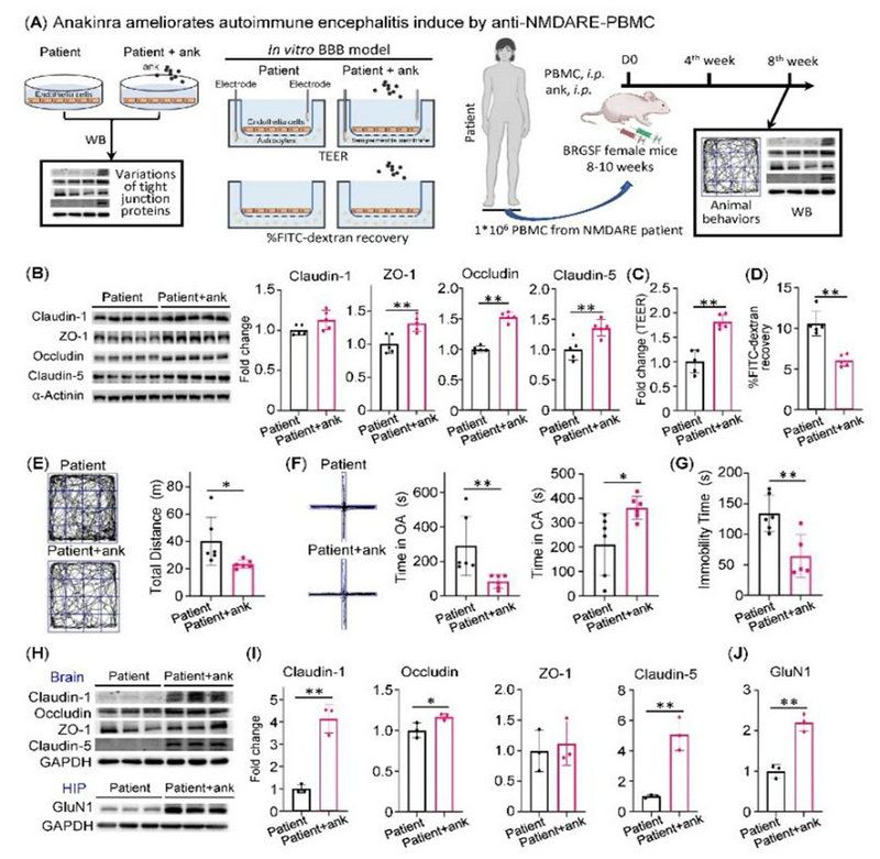 最后,該研究明確了IL-1受體拮抗劑(Anakinra, 阿那白滯素)對BBB的保護作用并可緩解模型小鼠的病情。課題組首次發現,在體外BBB模型上,Anakinra上調緊密連接蛋白ZO-1\Occludin\Claudin-5表達(圖4B)及緩解患者PBMC對BBB模型完整性的破壞(圖4C,D);在抗NMDAR腦炎人源化模型小鼠上也發現Anakinra可以改善小鼠的精神行為異常(圖4E-G)、上調腦組織緊密連接蛋白以及海馬組織中GluN1的表達(圖4H-J)。