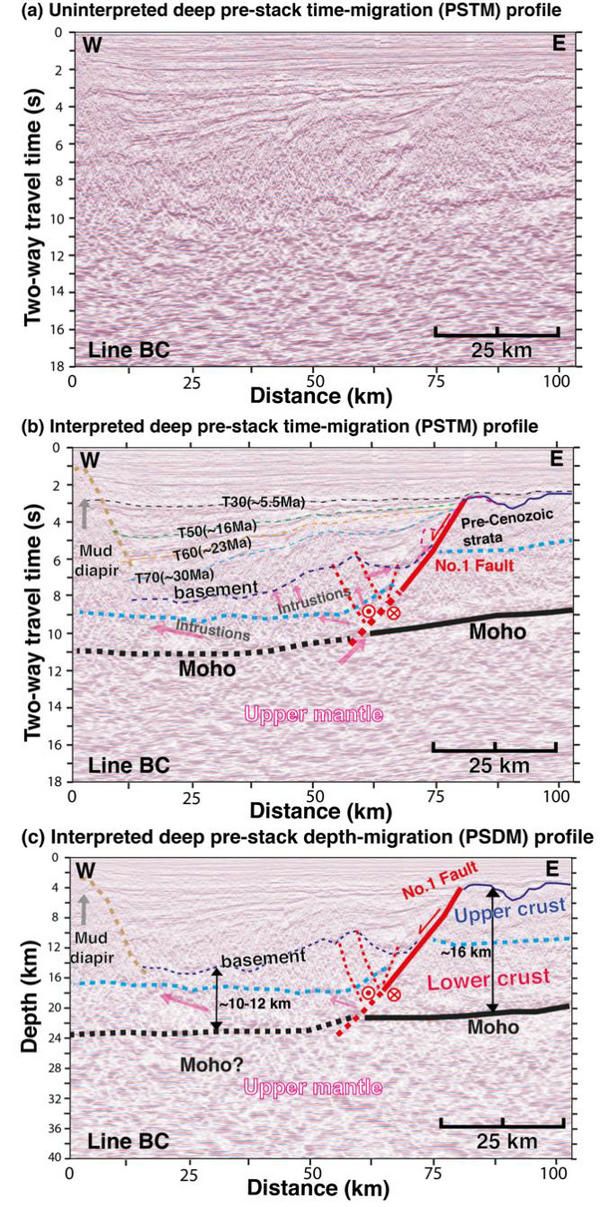 圖2 (a)未解釋的深反射疊前時(shí)間偏移剖面AB。紫色三角形指向莫霍面反射信號(hào)。藍(lán)色方框標(biāo)記了紅河斷裂北支一號(hào)斷裂下方地殼內(nèi)部不連續(xù)與錯(cuò)斷的反射同相軸,指示了紅河斷裂(即一號(hào)斷裂)的剪切作用形成了該區(qū)域復(fù)雜的反射地震信號(hào)。(b)解釋的深反射疊前時(shí)間偏移剖面AB。紅色(實(shí)線和虛線)表示解釋的深大斷裂。不同顏色的細(xì)虛線標(biāo)記了地層邊界。藍(lán)色實(shí)線和虛線代表解釋的沉積盆地基底。黑色實(shí)線和虛線代表解釋的莫霍面邊界。較粗的淺藍(lán)色虛線代表上地殼和下地殼的邊界。粉紅色箭頭指示巖漿侵入的可能路徑,粉紅色虛線表示巖漿侵入的頂部。Basement:沉積盆地基底;Upper crust:上地殼;Lower crust:下地殼;Moho:莫霍面;No. 1 Fault: 一號(hào)斷裂,即紅河斷裂在鶯歌海的北支;Yingdong Fault:鶯東斷裂;Intrusions:巖漿侵入;Upper mantle:上地幔。(c)與圖2b類似,但是為疊前深度偏移剖面AB。圖中數(shù)字代表地殼厚度。