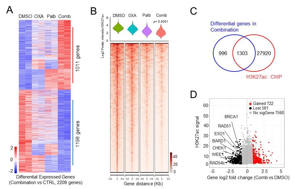 新輔助化療是目前臨床上治療局部晚期直腸癌的主要手段,但是約30%-60%的直腸癌患者對目前新輔助化療方案不敏感,腫瘤退縮較小或者甚至不退縮,然而臨床上又缺乏更多的藥物治療選擇,這群患者的術后輔助治療多是繼續(xù)沿用一線的化療方案,預后極差。為了探索腸癌新輔助化療耐藥的腫瘤分子特征,研究團隊首先收集了結直腸癌腫瘤組織進行轉錄組測序,再跟蹤隨訪病人化療效果,根據療效把病人分為化療敏感型和耐藥型,進行分組分析。結果發(fā)現(xiàn)耐藥型腫瘤組織中細胞周期相關的信號異常活化,提示以“靶向異常的細胞周期檢查點”尋找治療靶點可能可以逆轉化療耐藥。于是進一步利用小分子抑制劑文庫進行高通量篩選,發(fā)現(xiàn)CDK4/6抑制劑可以有效提高奧沙利鉑敏感性,并且可以協(xié)同抑制腫瘤細胞增殖。機制上,通過整合全轉錄組測序分析和染色質共沉淀測序分析發(fā)現(xiàn)CDK4/6抑制劑通過影響表觀遺傳修飾調控同源重組修復相關基因的表達,從而解釋了CDK4/6抑制劑為何可以逆轉奧沙利鉑耐藥現(xiàn)象的機制,該研究有望為新輔助化療耐藥的直腸癌患者提供新的用藥選擇(圖1)。