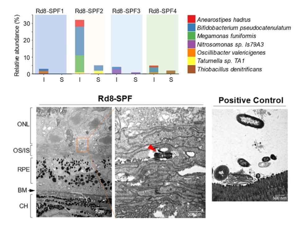 通過對Rd8小鼠視網膜宏轉錄組測序發現,有7種細菌現身于視網膜變性區域,其中多達5種是已知的腸道細菌。