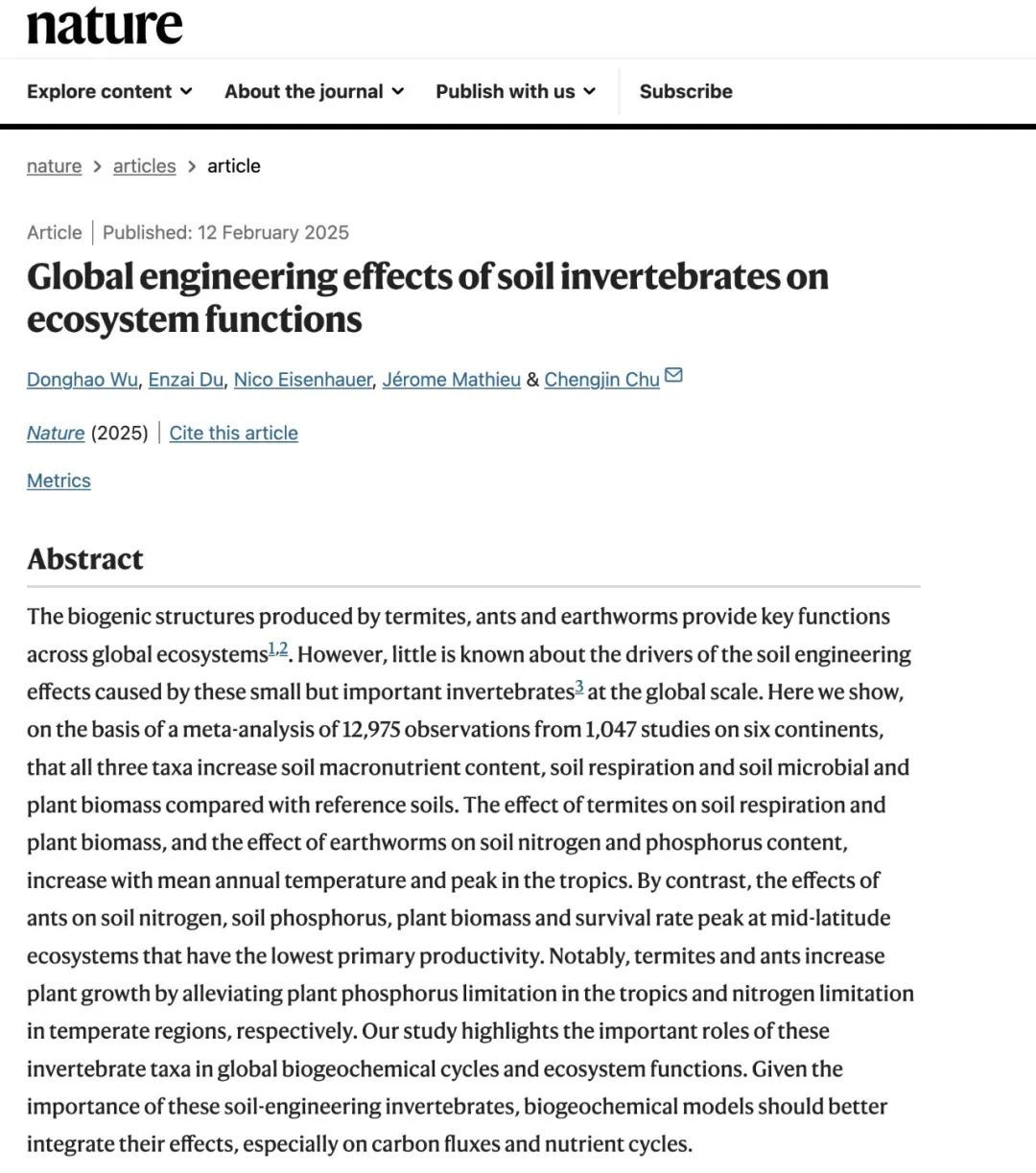 中大新聞網訊 2月12日,中山大學生態學院儲誠進教授團隊在《自然》(Nature)雜志發表論文,研究顯示,白蟻、螞蟻和蚯蚓等土壤無脊椎動物具有提升土壤肥力、改善土壤質地和促進作物產量的生態系統功能,對促進全球元素循環、物質降解和生物多樣性維持具有重要作用。這一研究為應對氣候變暖和促進生態修復提供了全新思路。