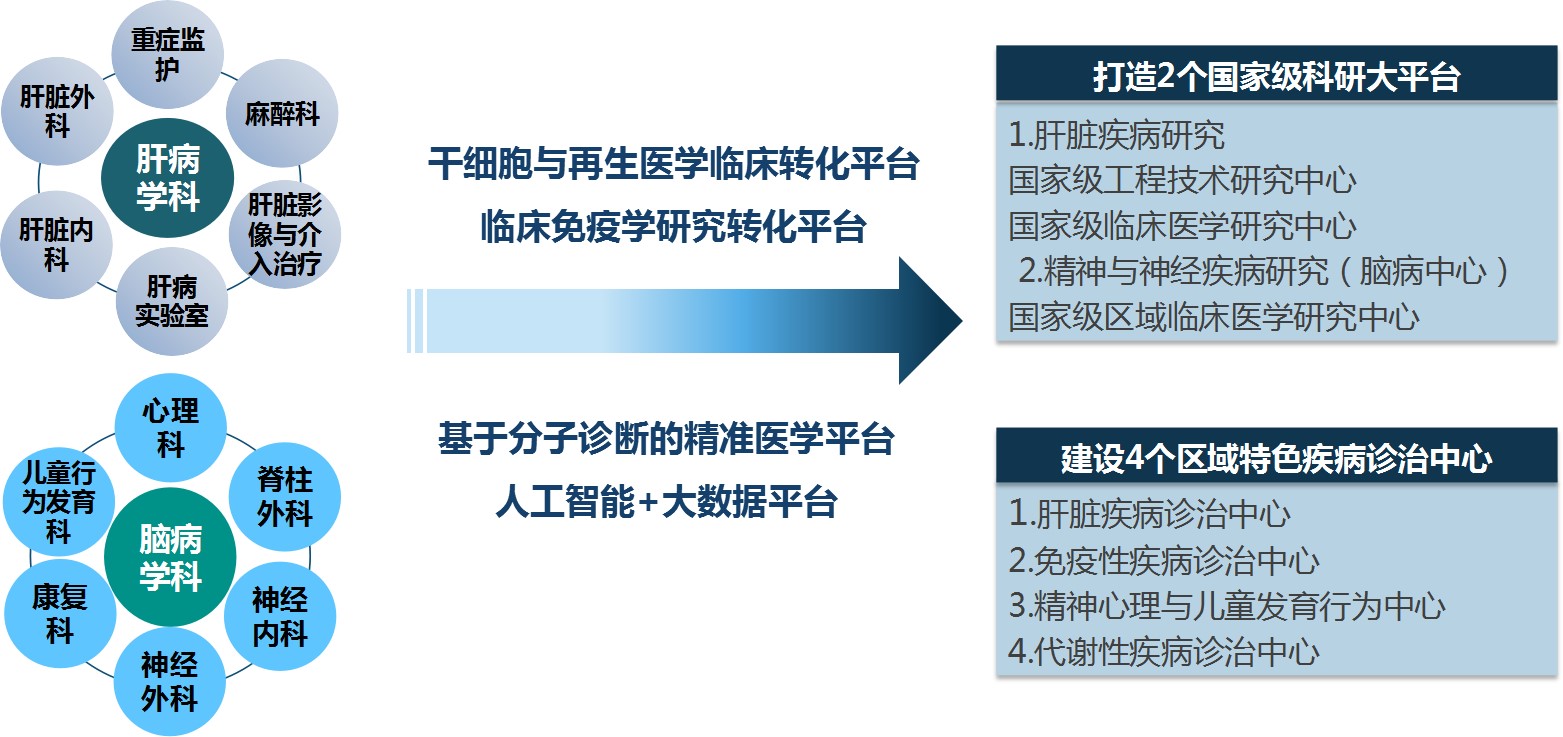 醫院在“十三五”規劃明確了大力加強多學科資源整合的思路,并確立了“1+3+4”發展路徑。即建設1個國家級大平臺(肝臟疾病),打造3個重點平臺(干細胞與再生醫學臨床轉化、臨床免疫學研究轉化、基于分子診斷的精準醫學平臺)和4個區域特色疾病診治中心(肝臟疾病診治中心、免疫性疾病診治中心、精神心理與兒童發育行為中心、代謝性疾病診治中心)。其中,以打造肝臟疾病國家級大平臺為醫院學科建設的重中之重。在此基礎上,面向國際腦科學發展趨勢以及國家“腦計劃”的重大戰略需求,進一步強強學科聯合,成立華南地區首個精神與神經疾病研究中心(簡稱“腦病中心”)。