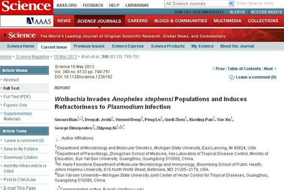 中山大學(xué)—密歇根州立大學(xué)熱帶病蟲媒控制聯(lián)合研究中心在2013年5月10日出版的第340 期國際頂級學(xué)術(shù)期刊《Science》發(fā)表論文《沃爾巴克氏體侵入斯氏按蚊種群中并誘導(dǎo)對瘧原蟲感染的抗性》(Wolbachia invade Anopheles stephensi Populations and Induces Refractoriness to Plasmodium Infection)。