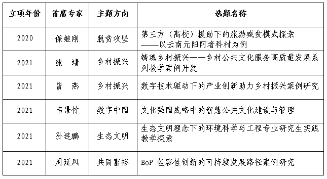 教育部學位與研究生教育發展中心組織開展的主題案例征集,面向名校名院名家,采用首席專家負責制,聚焦時代熱點,挖掘具有時代性、引領性、價值性的高質量案例資源。2020年首屆主題案例專項征集活動中,我校保繼剛教授牽頭的“脫貧攻堅”主題案例獲得立項支持。2021年,由我校張靖、曾燕、韋景竹、孫連鵬、周延風等5位教授牽頭的主題案例項目分別在“鄉村振興”“數字中國”“生態文明”和“共同富裕”四個主題獲得立項支持。