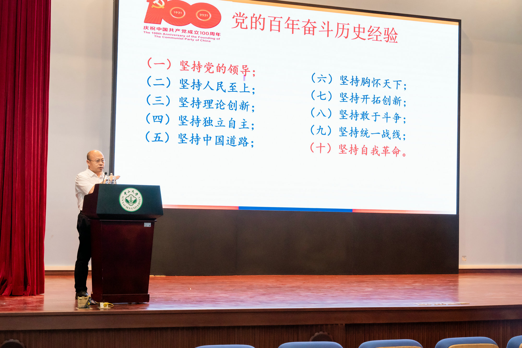 中大新聞網(wǎng)廣州5月12日電(通訊員王楠熙)5月10日上午,中山大學(xué)學(xué)習(xí)貫徹黨的十九屆六中全會(huì)精神暨黨史學(xué)習(xí)教育專題研討班系列集中培訓(xùn)第4講順利舉辦。馬克思主義學(xué)院院長(zhǎng)林進(jìn)平教授為學(xué)校全體中層領(lǐng)導(dǎo)人員、學(xué)校“青年干部管理能力提升班”第3期學(xué)員作《中國(guó)共產(chǎn)黨百年奮斗的歷史經(jīng)驗(yàn)》專題輔導(dǎo)報(bào)告。校黨委組織部副部長(zhǎng)劉潔予主持會(huì)議。根據(jù)學(xué)校疫情防控要求,本期培訓(xùn)主會(huì)場(chǎng)設(shè)在廣州校區(qū)南校園,同時(shí)在各校區(qū)(校園)、各附屬醫(yī)院設(shè)置網(wǎng)絡(luò)直播分會(huì)場(chǎng)。