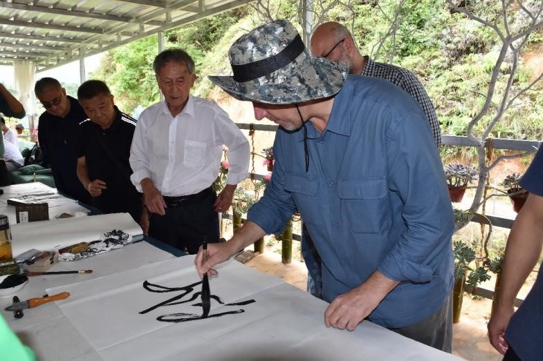 考察最后一天,當(dāng)?shù)貢視鴮憽懊烂琅c共”贈送給外籍教師,國際翻譯學(xué)院中東研究中心埃庫特副教授用阿拉伯文寫下“中國夢”回贈。