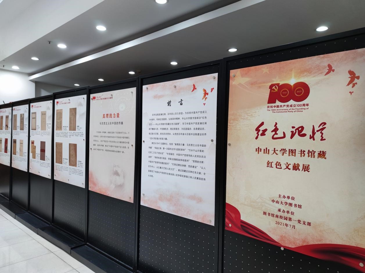 本次展覽的文獻選自學校圖書館館藏中具有代表性、珍稀性的紅色文獻,包括中國本土最早《共產黨宣言》選譯本、中國最早的《資本論》選譯本、中共第一份公開發行的機關刊物《向導》、中共在廣東創辦最早的地方黨報《廣東群報》、記錄省港大罷工的《省港罷工概觀》、1928年中共六大通過的《共產黨黨章》以及《從東南到西北——紅軍長征時代的真實史料》等長征著作早期版本、記錄中共領導全面抗戰的《中國共產黨抗戰文獻》、反映解放戰爭時期中山大學學生運動光榮歷史的《血債:“五卅一”紀念手冊》等。展覽分為8個主題單元,包括“真理的力量:馬克思主義在中國的傳播”“風起云涌:第一次國共合作與國民革命”“萬水千山只等閑:紅軍二萬五千里長征”“中流砥柱:中國共產黨領導的人民軍隊抗日戰爭”“將革命進行到底:奪取全國解放戰爭的勝利”“思想的光輝:中國共產黨領導創建的報刊”“打鐵還需自身硬:黨的建設”“以人民為中心:從左翼文藝到人民文藝”,深刻展現了中國共產黨領導全國各族人民爭取民族獨立和人民解放的偉大歷程。