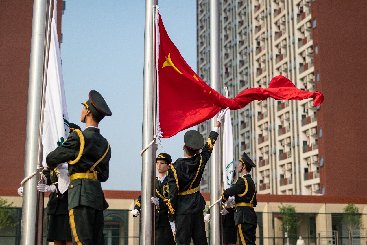 五星紅旗迎風飄揚,場面莊嚴肅穆,師生們心情無比激動、內心無比自豪。愛國榮校的家國情懷,流淌在師生心中。