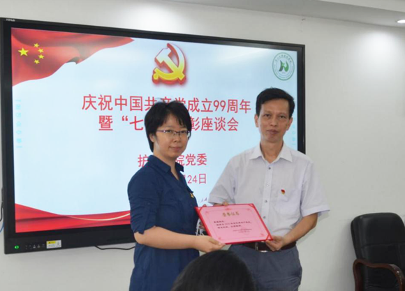陳昌齡書記為優(yōu)秀黨務(wù)工作者何笑霞老師頒發(fā)榮譽(yù)證書