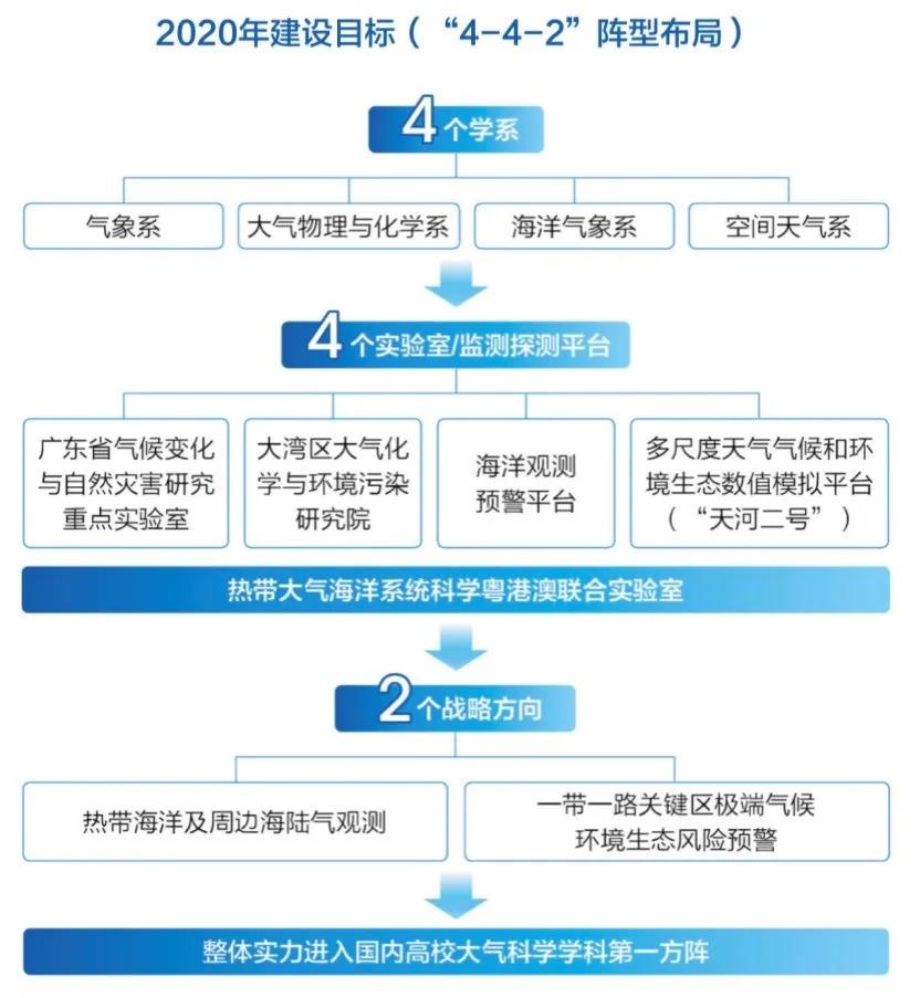 在十四五規劃的布局之年,大氣科學學院在原來“4-4-2”發展布局基礎上提出未來五年“5-3-1”的發展思路:“5”即在原來四個系的基礎上增加建立“冰凍圈科學系”,緊貼國家重大戰略和學術前沿,豐富學科增長點;“3”即緊密依托“廣東省氣候變化與自然災害研究重點實驗室”“熱帶大氣海洋系統科學教育部重點實驗室”“環珠江口氣候環境與空氣質量變化野外科學觀測研究站”三個省部級平臺,進一步聚集資源、整合隊伍,發揮大平臺效應;“1”即建立一個國家重點實驗室,明確以沖擊國內學科排名A+作為學院的奮斗目標。
