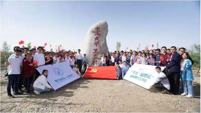 在中山大學生態林石碑前,研究生團手揮小國旗,在援疆導師沈寧教授、本地教師姜伶教授的帶領下合唱《我和我的祖國》,歌聲動聽,感情真摯,共同歌頌祖國的偉大,表達對祖國的熱愛。合唱后,研究生代表羅丹東、況君婷表示,作為新青年,今后將以麥蓋提人治沙為榜樣,堅定決心,克服困難,術業專攻,為新疆喀什醫療衛生事業進步發展貢獻中大青年的力量。