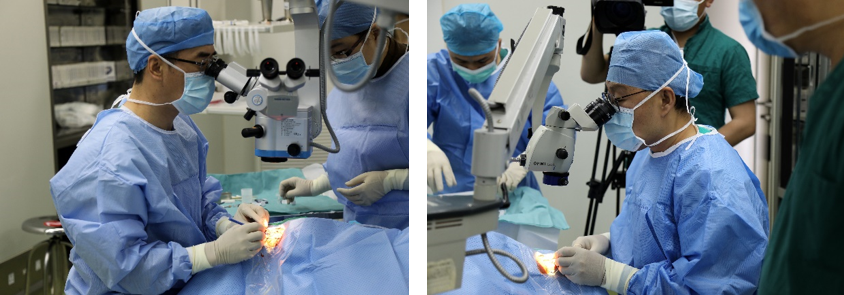 黃文勇(左)、王德才(右)兩位主刀醫生在玉樹八一醫院手術室行白內障復明手術(來源:中山眼科中心)