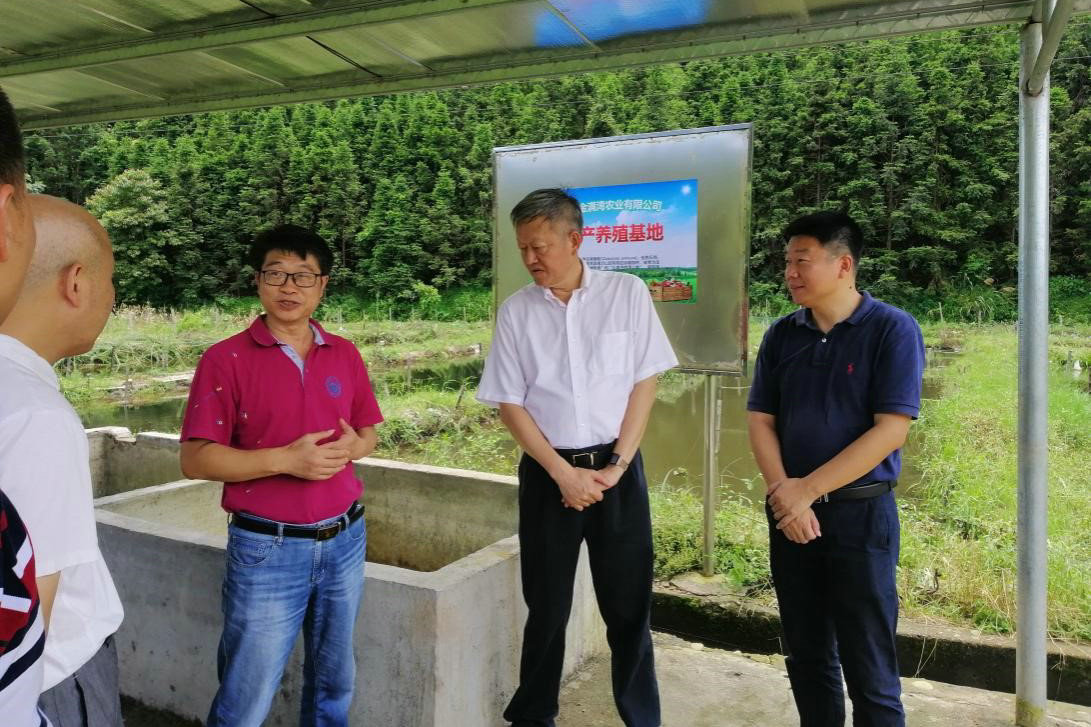 袁劍剛副教授(右三)匯報柯木灣村稻蛙魚產業基地情況