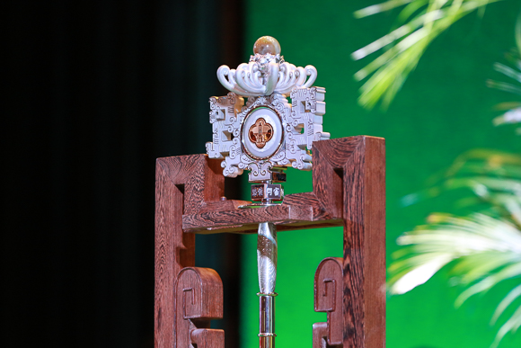 權(quán)杖入場,伴隨著現(xiàn)場畢業(yè)生的歡呼,現(xiàn)場屏幕和實時轉(zhuǎn)播會隨大門的開啟出現(xiàn)絢麗的特效。權(quán)杖安置或離開主禮臺權(quán)杖架時,屏幕中也會出現(xiàn)威嚴而神圣的光芒特效。一點的小巧思,為莊重的畢業(yè)典禮增添了幾分驚喜。