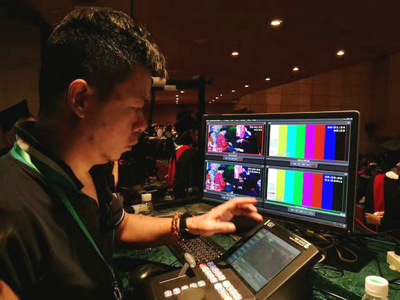 近年來,學位授予儀式采用全高清攝像機6個訊道進行轉(zhuǎn)播,目前在全國都處于領(lǐng)先水準。“每年的學位授予儀式總共持續(xù)四天,而我們團隊要連續(xù)工作五天。因為在儀式開始前我們都要進行各項儀器的架設(shè)和調(diào)試。”負責電視臺轉(zhuǎn)播工作的覃東駿介紹道,“想到這可能是畢業(yè)生離校前一次最難忘的經(jīng)歷,再大的困難我們也要想辦法克服。”