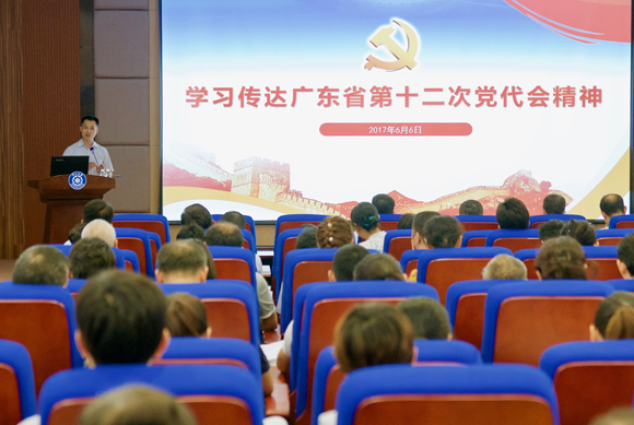 會上,林偉庭書記傳達了省第十二次黨代會精神。他指出,胡春華書記代表十一屆省委向大會作的報告,是廣東省改革發展進入關鍵階段的一次重要總結和規劃,報告以習近平總書記重要批示精神為統領,與每一個廣東人的過去、現在與將來息息相關。報告實事求是地回顧了全省砥礪奮進的五年,對全省綜合實力增長、創新驅動發展戰略實施、粵東西北地區振興發展實現新跨越、全面深化改革、生態環境改善、保障和民生改善等方面作了梳理,深入分析了全省面臨的困難和挑戰。林偉庭書記表示,報告在歸納總結過去五年發展的同時,以習近平總書記對廣東工作重要批示精神為未來五年工作總綱,以新起點上再創新局為要求,對全省未來深化供給側結構性改革、深入實施創新驅動發展戰略、加快構建開放型經濟新體制、統籌推進區域城鄉協調發展、推進綠色發展、高質量全面建成小康社會等工作做了規劃和安排,是我省未來五年發展的指導思想、主要目標和戰略部署,是指導未來各項事業發展的綱領性文件。