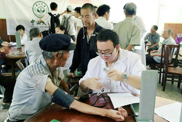 在“百所高校進(jìn)白山”暑期實踐活動中,羅浩宇為延邊村民義診