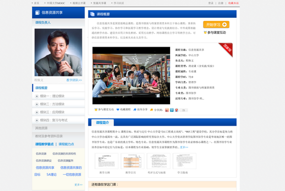 2013年6月,“信息資源共享”課程入選首批國家精品資源共享課程建設項目,并在國家精品開放課程共享平臺 “愛課程”網向公眾開放,成為全國圖書館、情報與檔案管理學科首門上線的國家精品資源共享建設課程,學術影響和社會反響十分廣泛。作為一門圖書館學本科專業核心課程,到目前為止該課程的訪問量已達到24680次。